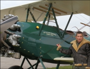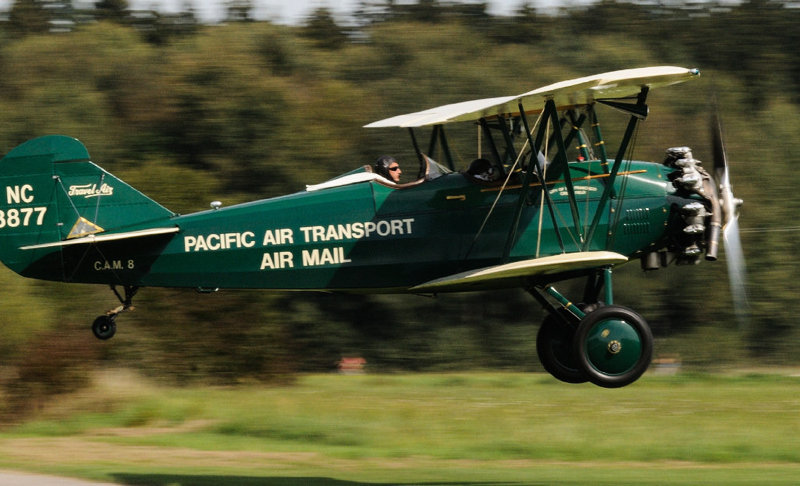 Sportflugzeugen und Doppeldeckern mit offenem Cockpit her, darunter die